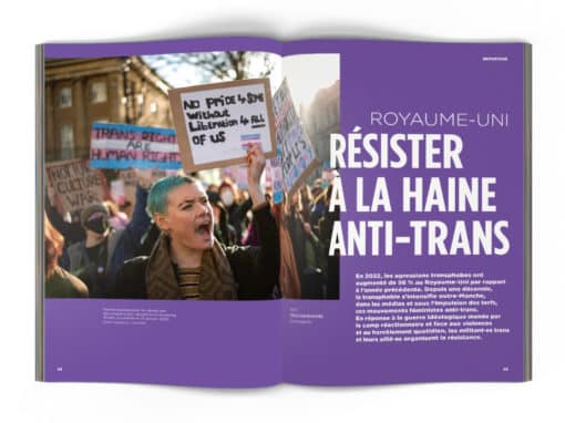 Mercredi 16 avril, la Cour suprême britannique a décidé d’exclure les femmes trans de la définition juridique du terme « femme ». La plus haute juridiction du pays a donné raison à une organisation militante transphobe qui s’opposait à l’inclusion des femmes trans dans le périmètre d’une mesure antidiscrimination votée par le Parlement d’Écosse en 2018. Depuis plus d’une décennie, la transphobie s’intensifie outre-Manche, dans les médias et sous l’impulsion des terfs, ces mouvements féministes anti-trans. Dans ce reportage publié en mai 2023, La Déferlante montre comment les militant·es trans et leurs allié·es organisent la résistance en réponse à la guerre idéologique menée par le camp réactionnaire et face aux violences et au harcèlement quotidien.