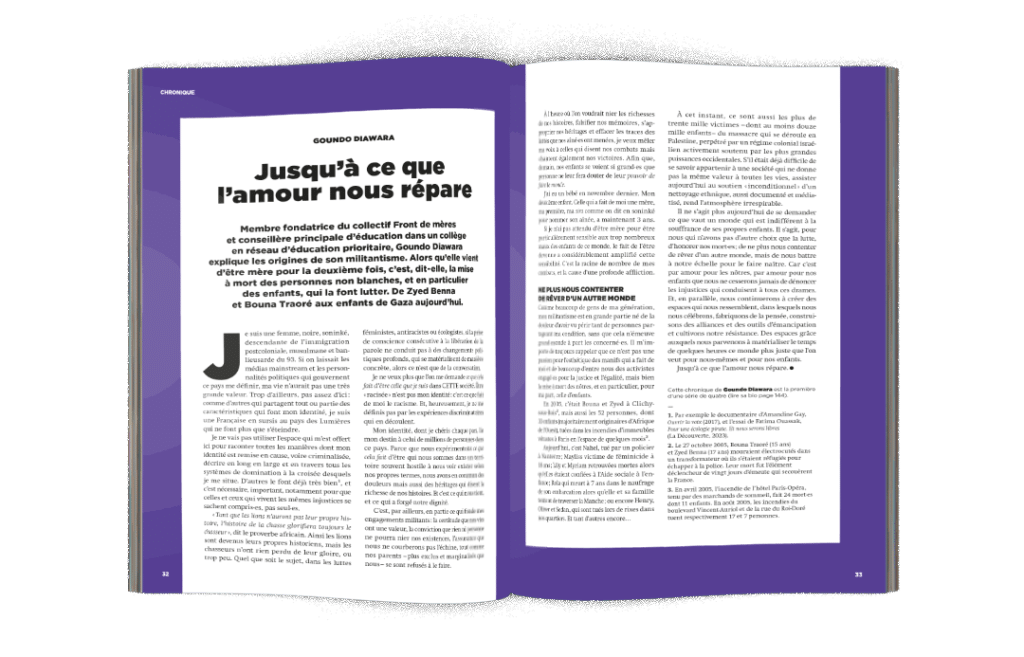 ALICE ZENITER Quand j’ai publié mes deux premiers romans, à 16 et 23 ans, bon nombre d’articles disaient que j’étais « un exemple parfait d’intégration ». Pendant un temps, je me suis sentie valorisée par ça. Mais j’ai toujours trouvé très dur de tenir une espèce de double discours : évidemment qu’une trajectoire sociale comme la mienne est possible, puisque je suis là. Mais ça amène mes interlocuteurs blancs et bourgeois à se sentir très à l’aise, à croire que leur système fonctionne, qu’il est accueillant.