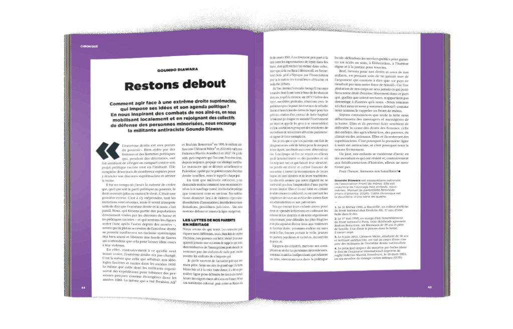 Jusqu’au 8 juillet, sur nos les réseaux sociaux et sur une page dédiée du site de La Déferlante, nous relaierons ces appels à mobilisation partout en France. En parallèle, nous finaliserons un numéro spécial intitulé « Résister en féministes » qui sortira le 30 août. Tout l’été, dans cette newsletter, vous pourrez également lire les parcours de militantes qui, partout en France et dans le monde, luttent contre l’extrême droite.