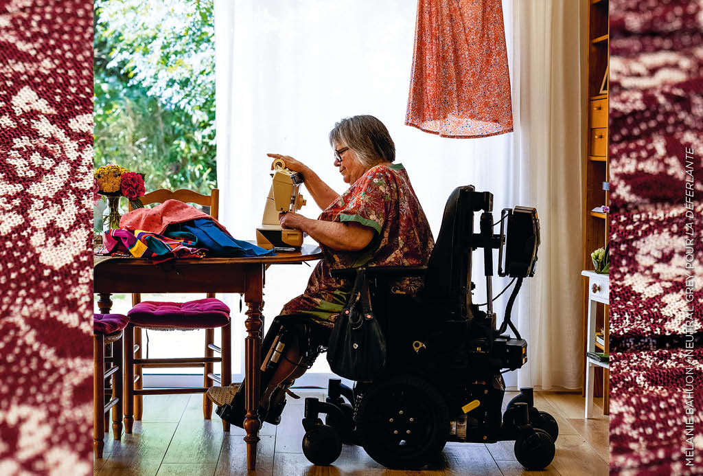Les vêtements de la grande distribution sont faits pour les minces, pour la démarche des gens que l’on dit valides, pas pour celle, balancée, de ma mère, quand elle marchait encore. Encore moins pour l’assise dans le fauteuil roulant. Alors pour être à l’aise et grappiller son droit à la coquetterie, ses vêtements, elle les a faits sur mesure. Elle les a adaptés à sa vie.