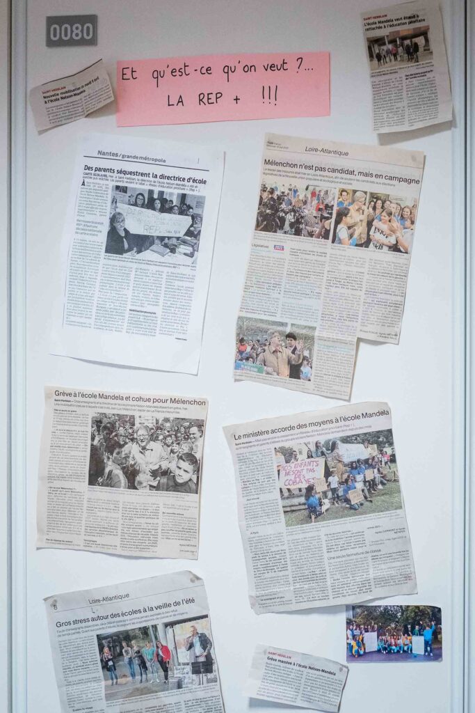 Un mur couvert de photos et de coupures de presse : la décoration colorée de la salle de pause de l’école Nelson-Mandela raconte les mobilisations qui ont pu souder son équipe ces derniers temps. Le groupe scolaire implanté à Saint-Herblain (Loire-Atlantique) jouxte le Sillon de Bretagne, un des quartiers les plus pauvres de France.