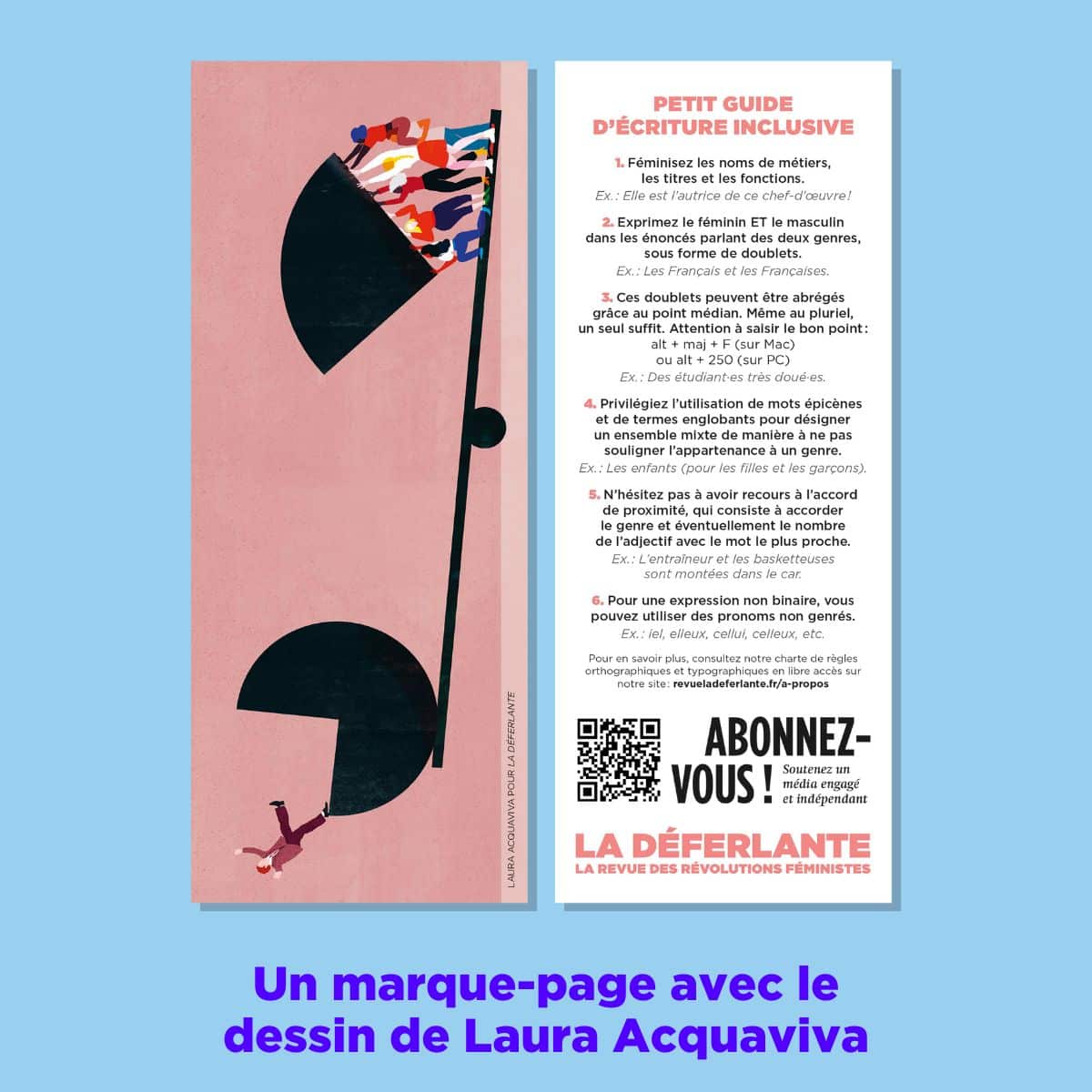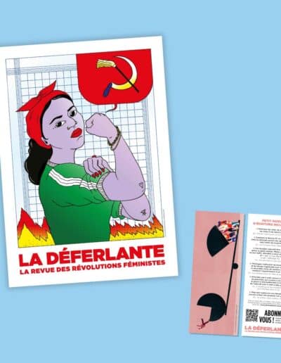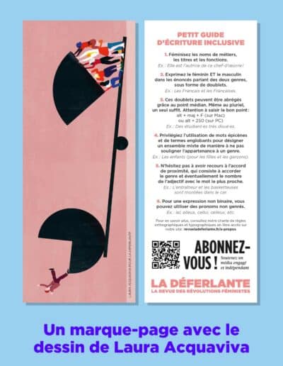 Pour la sortie de notre nouveau numéro, nous vous proposons un pack contenant tous les goodies. Ce pack à 8 euros comprend : ✓ L’affiche « Travailler », dessinée par Lucile Gautier, au format A2 ✓ Le marque-page dessiné par Laura Acquaviva avec un petit guide d’écriture inclusive au verso ⟶ Vous souhaitez recevoir La Déferlante en avant-première, au tarif de 15 euros (au lieu de 19), et sans engagement ? Découvrez notre offre d’abonnement à durée libre.