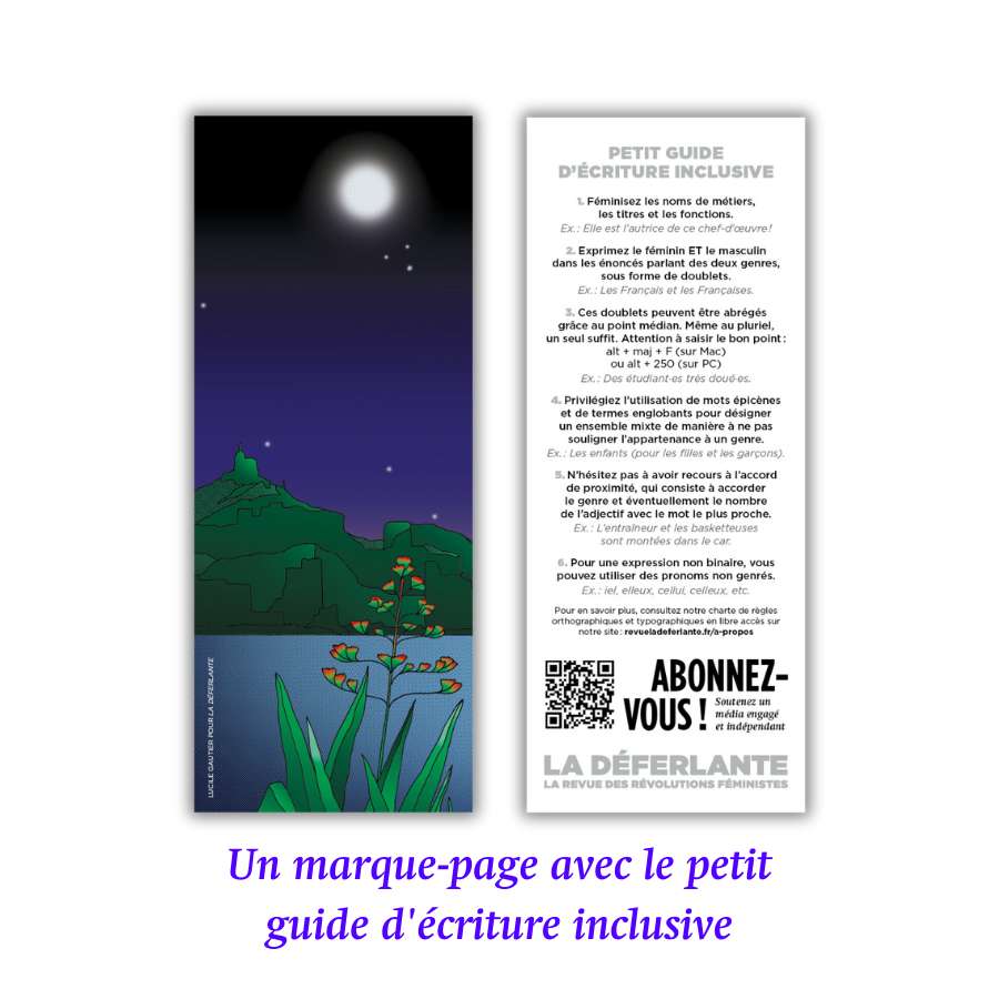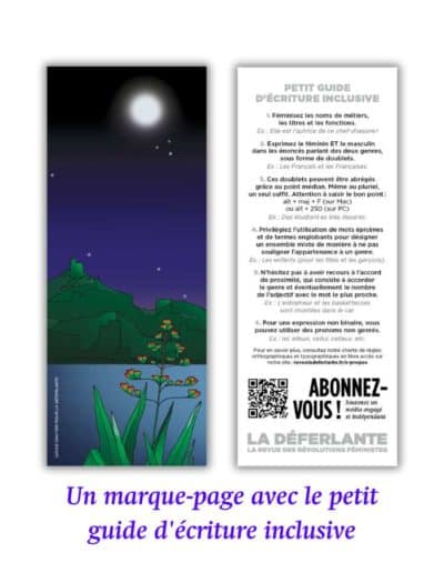 ✓ Le marque-page du numéro 12 « Rêver » dessiné par Lucile Gautier, avec au verso le petit guide d’écriture inclusive