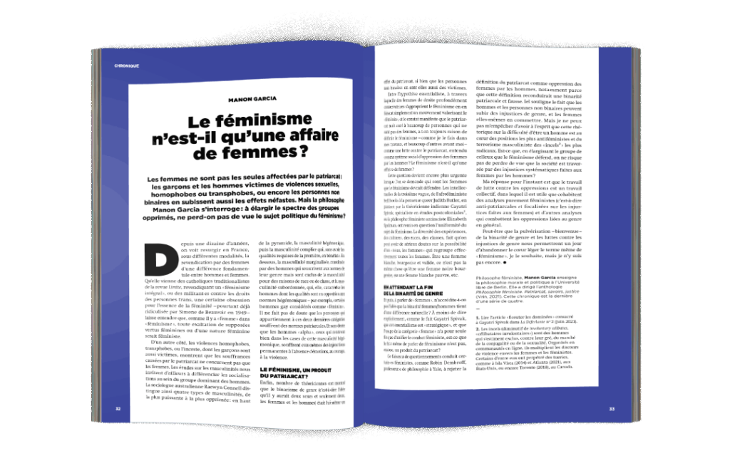 Les identités, dans ce cadre, n’apparaissent pas tant comme une menace que comme un appel à la vigilance : notre universalisme en est-il bien un ? N’imposons-nous pas, en son nom, nos propres normes culturelles, parfois discutables ? Au fond, ces politiques de l’identité nous invitent à un étonnement qui est au cœur de l’activité philosophique, à une mise en danger des évidences qui incite à décaler le regard et à adopter des perspectives originales. Elles enrichissent une recherche d’universalité et d’humanité commune plutôt qu’elles ne la mettent à mort. Elles disent : assurons-nous que notre humanité est un véritable nous et non un nous dont sont exclu·es les opprimé·es.